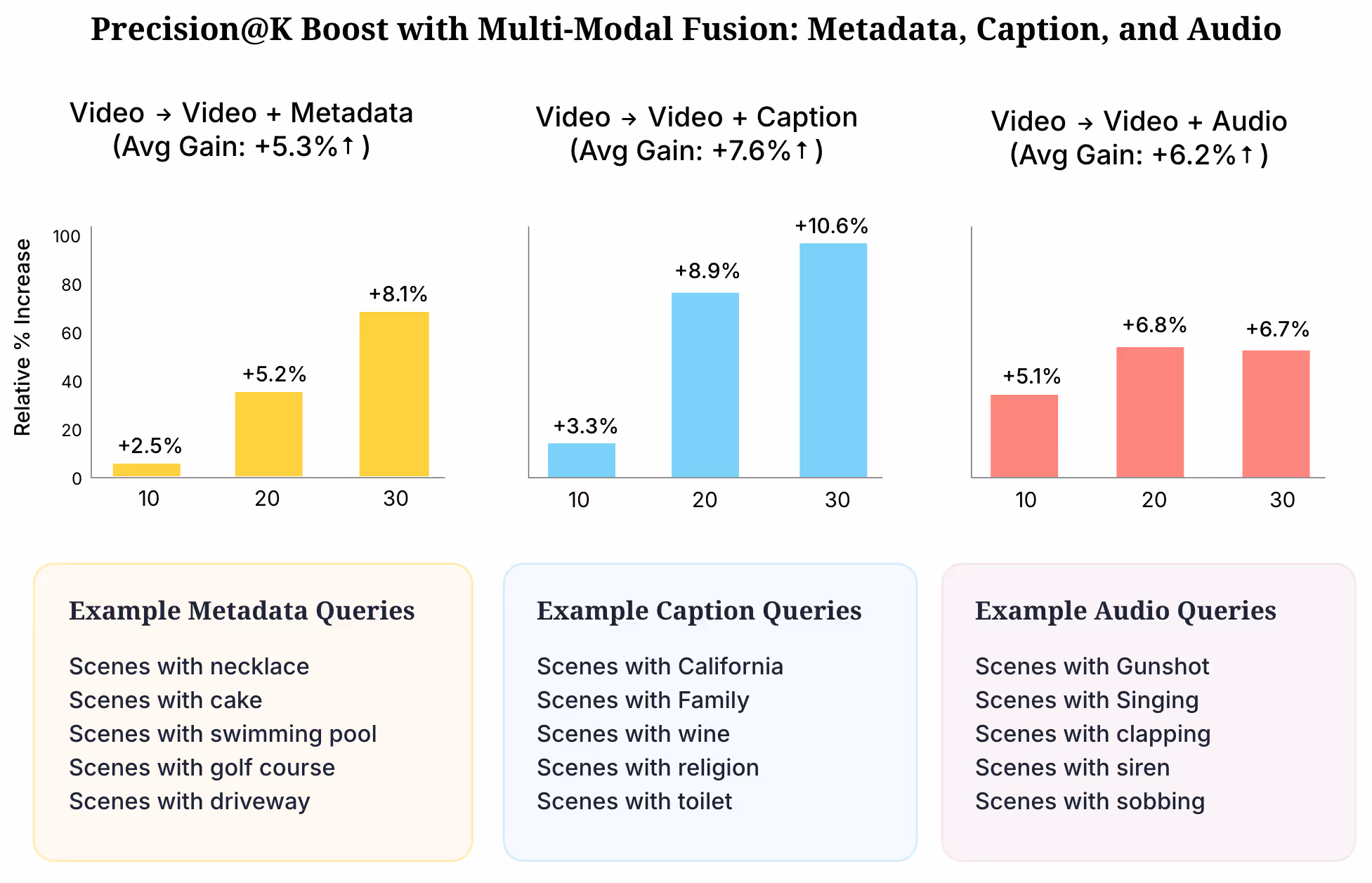 Figure 1 compares video-only retrieval with retrieval augmented by additional modalities. Integrating captions, metadata, and audio consistently enhances precision across various Top-K values. On average, captions improve relative precision by 7.6%, metadata by 5.3%, and audio signals add another 6.2%, demonstrating the significant impact of multimodal integration.